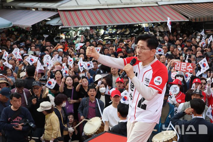 [대구=뉴시스] 고승민 기자 = 김문수 국민의힘 대선후보가 12일 대구 달성로 서문시장에서 시민들에게 지지를 호소하고 있다. 2025.05.12.kkssmm99@newsis.com |