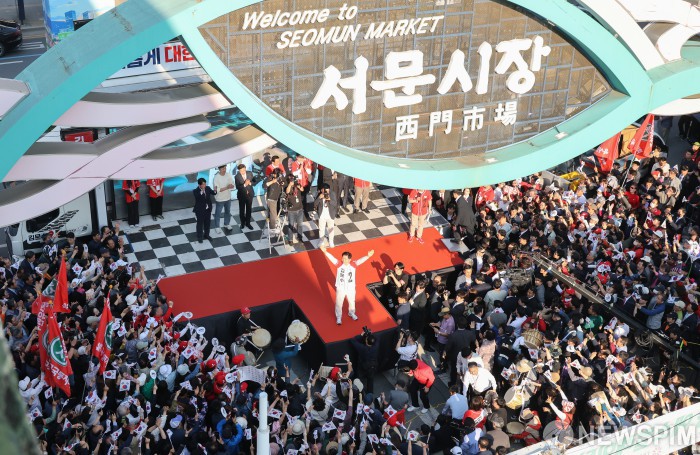 [대구=뉴스핌] 최지환 기자 = 김문수 국민의힘 대선후보가 12일 오후 대구 중구 서문시장에서 열린 유세에서 시민들에게 지지를 호소하고 있다. 2025.05.12 choipix16@newspim.com