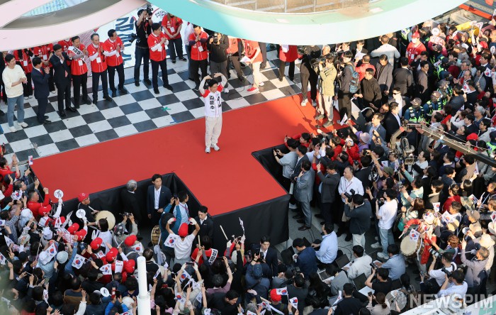 [대구=뉴스핌] 최지환 기자 = 김문수 국민의힘 대선후보가 12일 오후 대구 중구 서문시장에서 열린 유세에서 시민들에게 지지를 호소하고 있다. 2025.05.12 choipix16@newspim.com