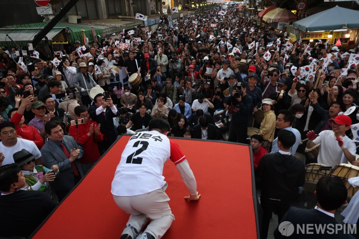 [대구=뉴스핌] 최지환 기자 = 김문수 국민의힘 대선후보가 12일 오후 대구 중구 서문시장 유세현장에서 시민들에게 큰 절을 하고 있다. 2025.05.12 choipix16@newspim.com