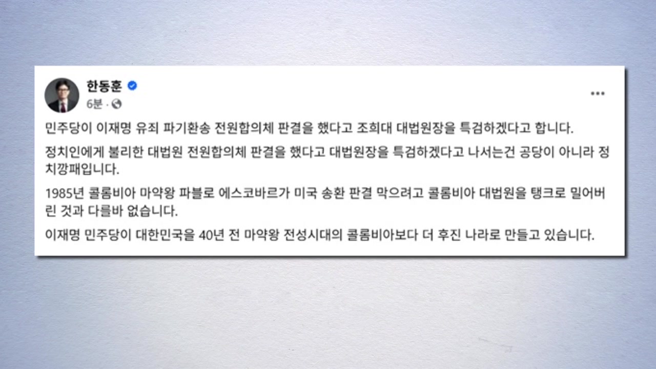 한 전 대표는 자신의 SNS에, 정치인에게 불리한 판결을 했다고 대법원장을 특검하겠다고 나선 거 아니냐며 이같이 지적했습니다.