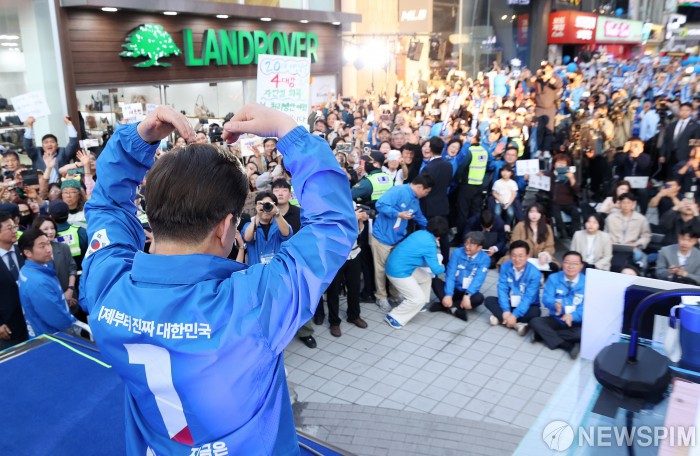 [대전=뉴스핌] 정일구 기자 = 이재명 더불어민주당 대선 후보가 6·3 대통령선거 공식 선거운동 첫날인 12일 오후 대전 중구 으능정이거리 스카이로드에서 열린 'K-과학기술' 대전 유세에 참석해 시민들에게 손하트를 하고 있다. 2025.05.12 mironj19@newspim.com