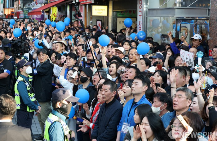 [대전=뉴스핌] 정일구 기자 = 이재명 더불어민주당 대선 후보가 6·3 대통령선거 공식 선거운동 첫날인 12일 오후 대전 중구 으능정이거리 스카이로드에서 열린 'K-과학기술' 대전 유세에 참석해 연설을 하는 가운데 시민들이 환호하고 있다. 2025.05.12 mironj19@newspim.com