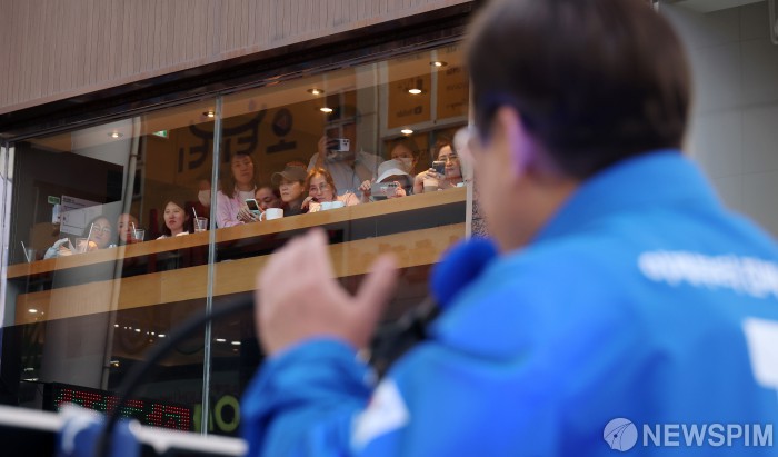 [대전=뉴스핌] 정일구 기자 = 6·3 대통령선거 공식 선거운동 첫날인 12일 오후 대전 중구 으능정이거리 스카이로드에서 시민들이 'K-과학기술' 대전 유세에 나선 이재명 더불어민주당 대선 후보의 연설을 바라보고 있다. 2025.05.12 mironj19@newspim.com
