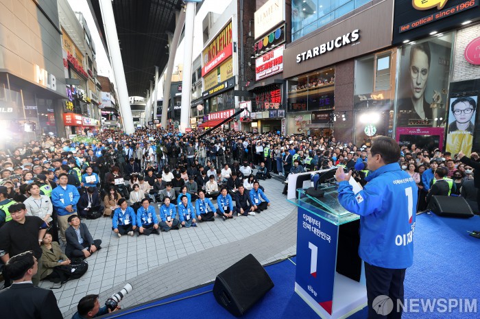 [대전=뉴스핌] 정일구 기자 = 이재명 더불어민주당 대선 후보가 6·3 대통령선거 공식 선거운동 첫날인 12일 오후 대전 중구 으능정이거리 스카이로드에서 열린 'K-과학기술' 대전 유세에 참석해 연설을 하고 있다. 2025.05.12 mironj19@newspim.com