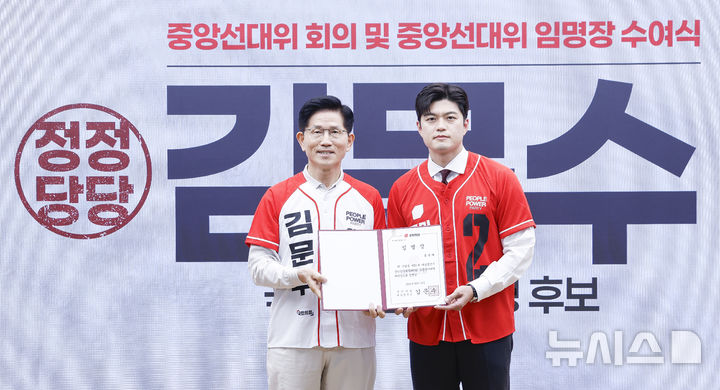 [서울=뉴시스] 조성봉 기자 = 김문수국민의힘 대선후보가 12일 서울 여의도 국민의힘 중앙당사에서 열린 중앙선거대책위원회 임명장 수여식에서 김용태 (오른쪽) 공동선대위원장에게 임명장 전달 후 기념촬영을 하고 있다.(공동취재) 2025.05.12. photo@newsis.com |