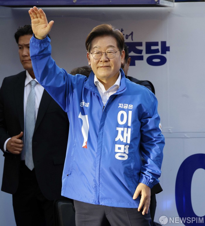 [대전=뉴스핌] 정일구 기자 =이재명 더불어민주당 대선 후보가 6·3 대통령선거 공식 선거운동 첫날인 12일 오후 대전 중구 으능정이거리 스카이로드에서 열린 'K-과학기술' 대전 유세에 참석해 시민들에게 인사하고 있다. 2025.05.12 mironj19@newspim.com