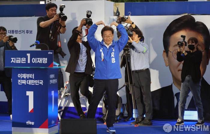 [대전=뉴스핌] 정일구 기자 = 이재명 더불어민주당 대선 후보가 6·3 대통령선거 공식 선거운동 첫날인 12일 오후 대전 중구 으능정이거리 스카이로드에서 열린 'K-과학기술' 대전 유세에 참석해 시민들에게 손하트를 하고 있다. 2025.05.12 mironj19@newspim.com