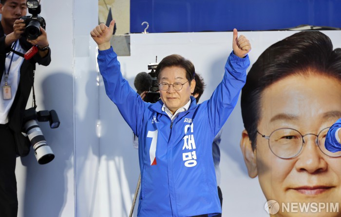 [대전=뉴스핌] 정일구 기자 = 이재명 더불어민주당 대선 후보가 6·3 대통령선거 공식 선거운동 첫날인 12일 오후 대전 중구 으능정이거리 스카이로드에서 열린 'K-과학기술' 대전 유세에 참석해 지지를 호소하고 있다. 2025.05.12 mironj19@newspim.com