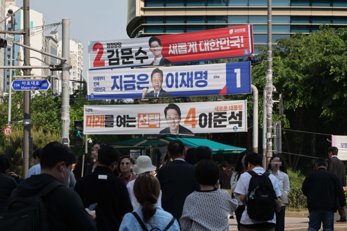 제21대 대선 선거운동이 시작된 12일 서울 마포구의 한 거리에 이재명 더불어민주당, 김문수 국민의힘, 이준석 개혁신당 대선 후보의 현수막이 걸려 있다. 2025.5.12 [한주형 기자] |