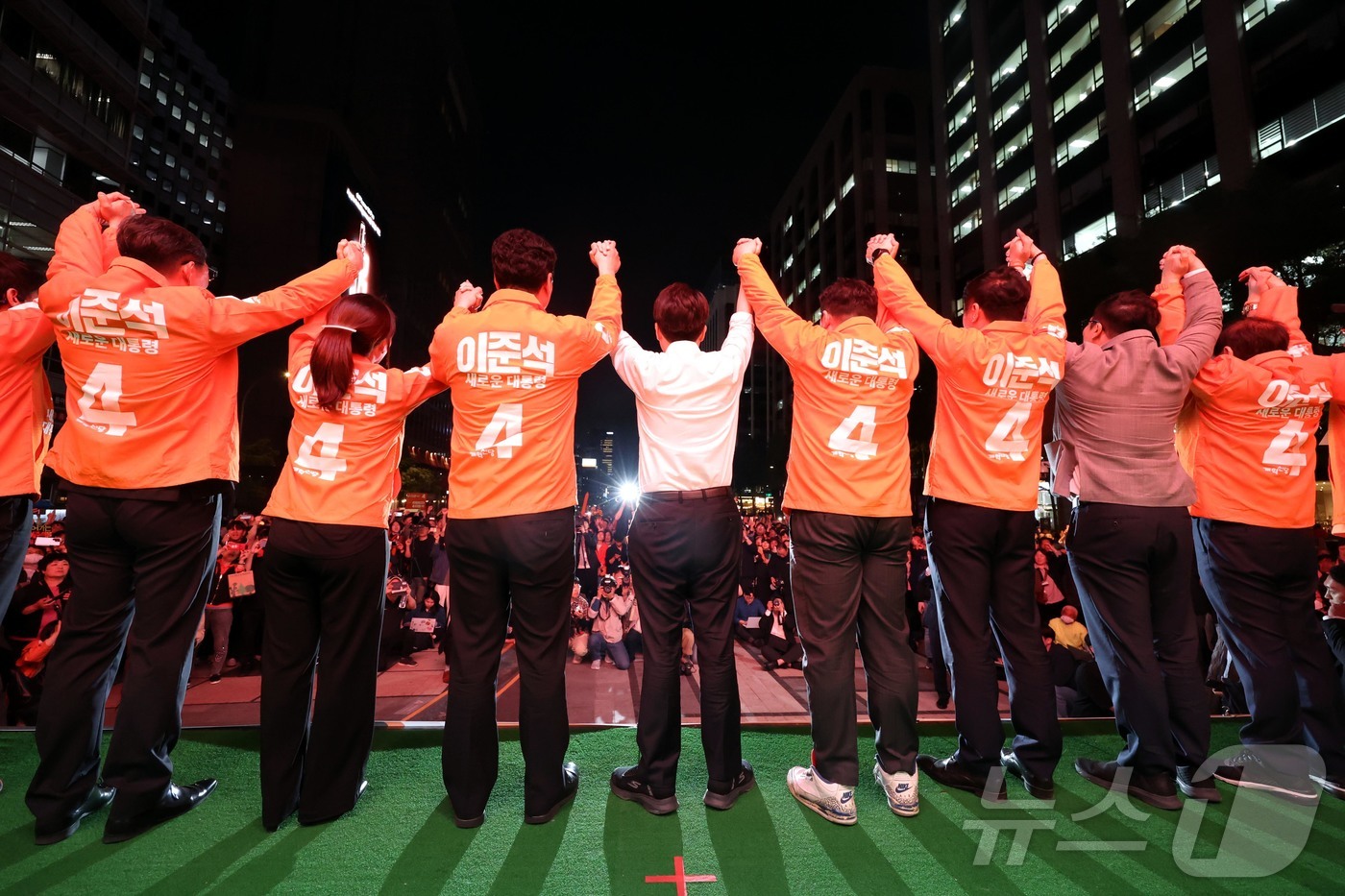 (서울=뉴스1) 박정호 기자 = 이준석 개혁신당 대통령 후보가 공식 선거운동이 시작된 12일 서울 중구 청계광장에서 가진 서울 첫 집중유세에서 선대위원장 등과 함께 지지를 호소하고 있다. (공동취재) 2025.5.12/뉴스1