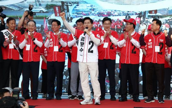 김 후보가 시장을 짧게 한 바퀴 돈 뒤 단상 위에 오르자 지지자들은 "김문수, 대통령"을 연호했고, 김 후보는 양팔로 하트를 그리며 화답했다.