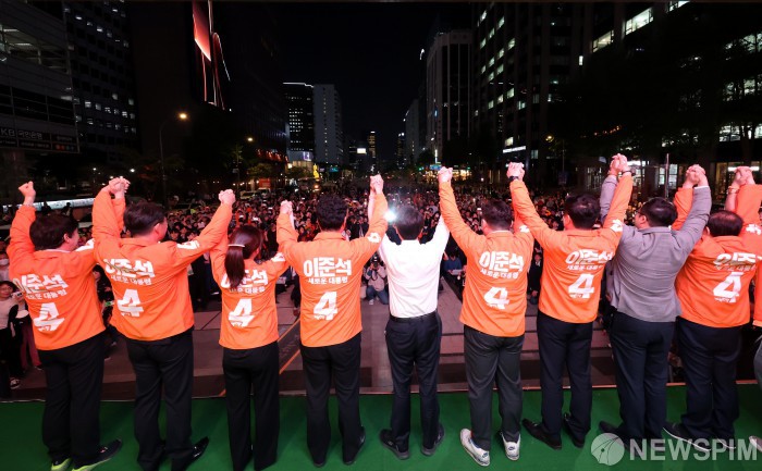 [서울=뉴스핌] 이길동 기자 = 이준석(가운데) 개혁신당 대선후보와 선거대책위원회 관계자들이 12일 오후 서울 중구 청계광장에서 열린 집중유세에서 손을 잡고 시민들에게 지지를 호소하고 있다. 2025.05.12 gdlee@newspim.com |