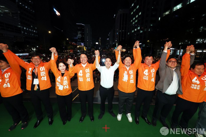 [서울=뉴스핌] 이길동 기자 = 이준석(가운데) 개혁신당 대선후보와 선거대책위원회 관계자들이 12일 오후 서울 중구 청계광장에서 열린 출정식에서 손을 잡고 시민들에게 지지를 호소하고 있다. 2025.05.12 gdlee@newspim.com