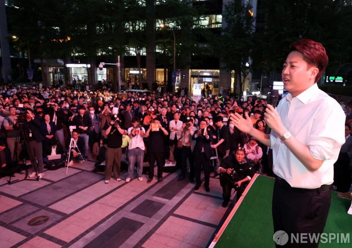 [서울=뉴스핌] 이길동 기자 =이준석 개혁신당 대선후보가 12일 오후 서울 중구 청계광장에서 열린 출정식에서 시민들에게 지지를 호소하고 있다. 2025.05.12. 2025.05.12 gdlee@newspim.com