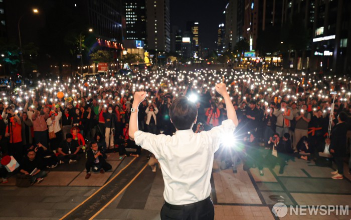 [서울=뉴스핌] 이길동 기자 = 이준석 개혁신당 대선후보가 12일 오후 서울 중구 청계광장에서 열린 출정식에서 시민들에게 지지를 호소하고 있다. 2025.05.12 gdlee@newspim.com