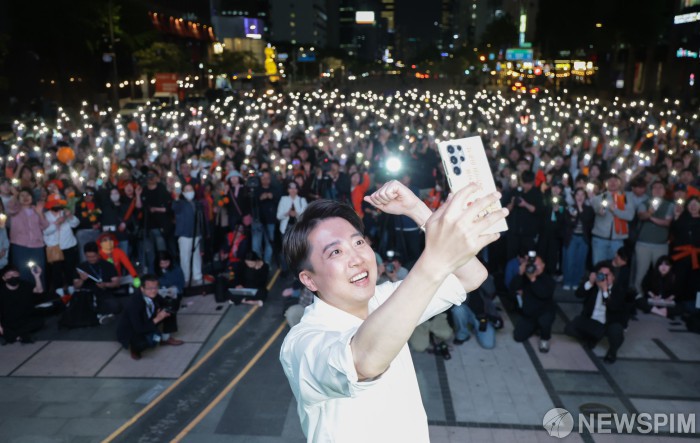 [서울=뉴스핌] 이길동 기자 = 이준석 개혁신당 대선후보가 12일 오후 서울 중구 청계광장에서 열린 출정식에서 시민들과 셀카를 찍고 있다. 2025.05.12 gdlee@newspim.com