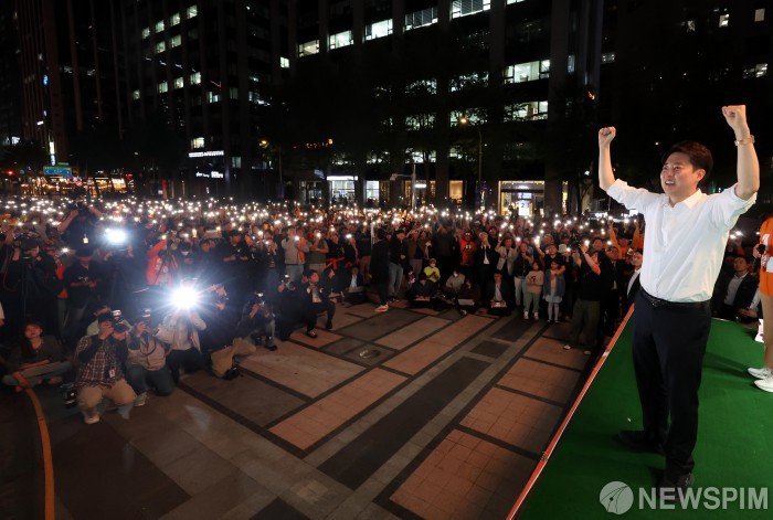 [서울=뉴스핌] 이길동 기자 = 이준석 개혁신당 대선후보가 12일 오후 서울 중구 청계광장에서 열린 집중유세에서 시민들에게 지지를 호소하고 있다. 2025.05.12gdlee@newspim.com