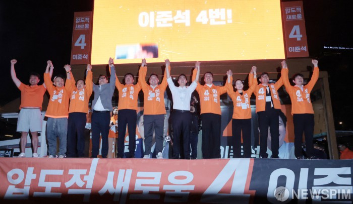 [서울=뉴스핌] 이길동 기자 = 이준석 개혁신당 대선후보가 12일 오후 서울 중구 청계광장에서 열린 출정식에서 선대위원장들과 두 팔을 들어올리며 시민들에게 인사하고 있다.2025.05.12 gdlee@newspim.com
