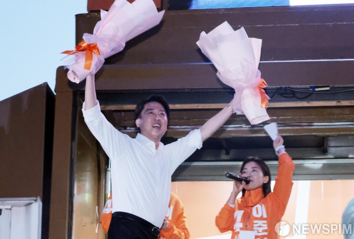 [서울=뉴스핌] 이길동 기자 =이준석 개혁신당 대선후보가 12일 오후 서울 중구 청계광장에서 열린 출정식에서 꽃다발을 들고 시민들에게 인사를 하고 있다. 2025.05.12 gdlee@newspim.com