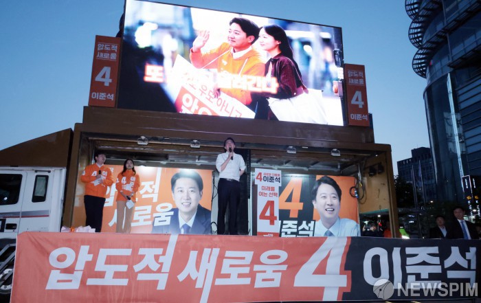 [서울=뉴스핌] 이길동 기자 =이준석 개혁신당 대선후보가 12일 오후 서울 중구 청계광장에서 열린 출정식에서 시민들에게 지지를 호소하고 있다.2025.05.12 gdlee@newspim.com