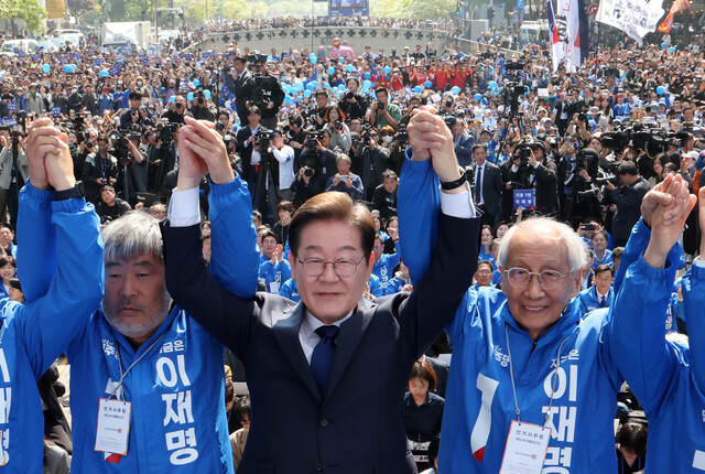 이재명 더불어민주당 대통령 후보가 12일 서울 청계광장 첫 유세에서 선거대책위원장단과 함께 손을 들어 인사하고 있다. 공동취재사진 |