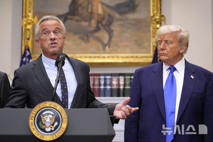 [워싱턴=AP/뉴시스] 도널드 트럼프 미국 대통령이 12일 백악관에서 약품 가격 하락에 대한 행정명령에 서명한 뒤 로버트 케네디 주니어 보건복지부 장관과 함께 기자들의 질문에 답하고 있다. 2025.05.13. |