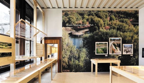 정영선은 한국 근현대 조경 역사를 일군 산증인이다. 그의 손을 거쳐 탄생한 경춘선 숲길과 여의도 샛강 생태공원, 선유도 공원 등 대표작 24개의 도면, 모형, 사진, 영상 등 300여 점의 기록 자료를 펼쳤다. 국내외 주요 건축가와의 다양한 협업도 조명했다. 미술관은 “정원과 리조트, 기념비적인 조경, 생태공원, 한국 고유의 정원 문화 등 작업의 성격에 따라 7개의 주제로 구성했다”며 “한국 전통 누각에 올라 풍광을 살펴보는 방식으로 전시 공간을 꾸몄다”고 했다.