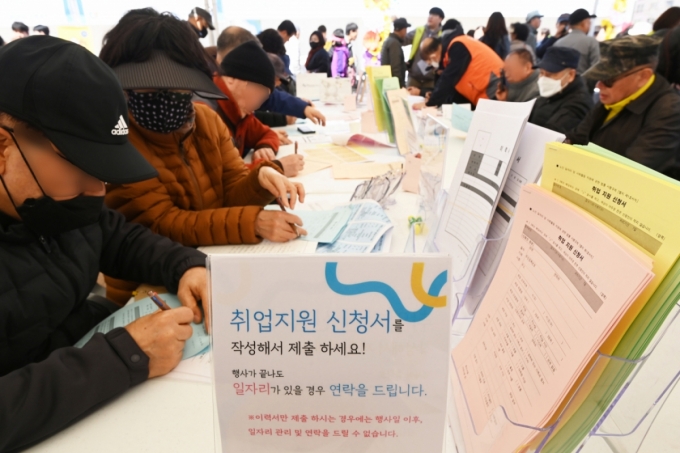 경기도 수원시 팔달구 화성행궁 광장에서 열린 '노인일자리 채용한마당'을 찾은 어르신들이 취업지원 신청서를 작성하고 있다. /사진=뉴시스 |