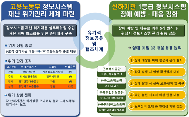 올 4월에 마련된 실무매뉴얼은 고용부 정보시스템 재난 대응에 필요한 조치 사항과 절차·위기관리 체계를 규정한 것으로 각 기관 간 역할 분담과 협력 방안을 명확히 했다.