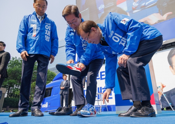 이 후보는 전날 서울 광화문 청계광장에서 열린 출정식에서 착용하고 있던 구두를 벗고, 민주당을 상징하는 파란색과 보수의 상징색인 빨간색이 혼합된 운동화로 갈아 신었다. 운동화에는 ‘지금은 이재명’, ‘이제부터 진짜 대한민국’이라는 선거 구호가 붙어 있었다.