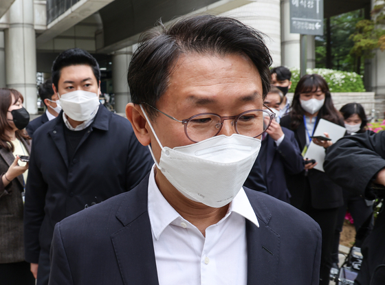 뇌물수수 혐의로 고위공직자범죄수사처(공수처)에서 '1호'로 기소된 김형준 전 부장검사가 2022년 4월 22일 오전 서울 서초구 서초동 서울중앙지법에서 1심 첫 공판을 마치고 법원을 빠져 나가고 있다. 연합뉴스 |