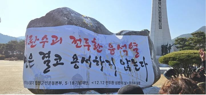 지난해 12월12일 경남 합천 일해공원 이름돌이 ‘내란수괴 전두환 윤석열 국민은 결코 용서하지 않는다’라고 적힌 천으로 덮여있고 ‘12·3 윤석열과 12·12 전두환 심판의 날’ 참가자들이 던진 밀가루와 달걀이 묻어 있다. 최상원 기자 |