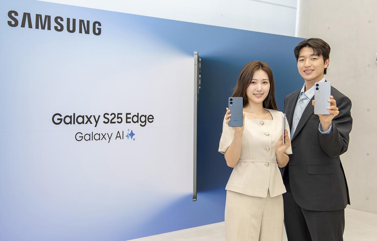 13일 오전 서울 서초구 ‘삼성 강남’에서 모델들이 삼성전자의 초슬림 스마트폰 신제품 ‘갤럭시 S25 엣지’를 들어 보이고 있다. 삼성전자 제공 |