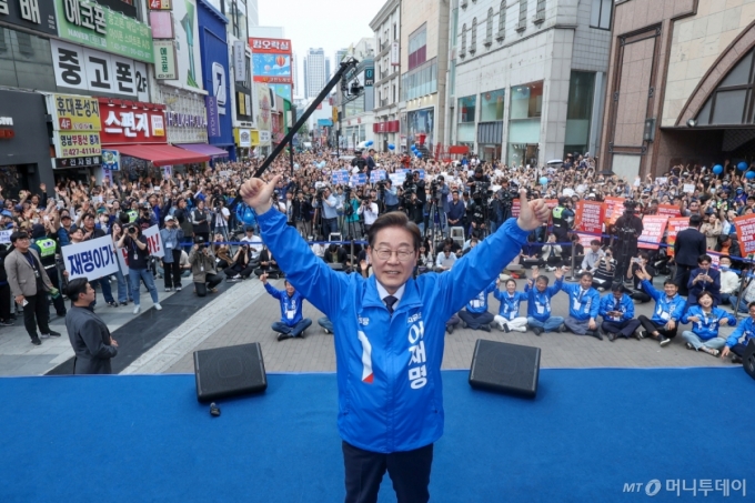 (대구=뉴스1) 안은나 기자 = 이재명 더불어민주당 대통령 후보가 대표적 험지인 대구·경북(TK) 지역 유세에 돌입한 13일 오후 대구 중구 동성로에서 연설을 마친 뒤 두손을 번쩍 들고 있다. 2025.5.13/뉴스1 Copyright (C) 뉴스1. All rights reserved. 무단 전재 및 재배포, AI학습 이용 금지. /사진=(대구=뉴스1) 안은나 기자 |