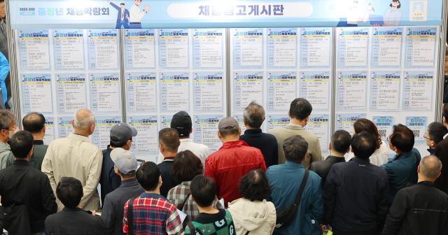 인천 남동구 인천시청 중앙홀에서 열린 2025 중장년 채용박람회를 찾은 구직자들이 채용공고 게시판을 살펴보고 있다. [사진=연합뉴스] |
