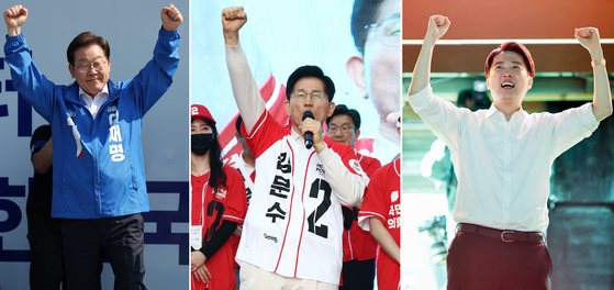 지난 12일 대선 공식 선거운동에 나선 더불어민주당 이재명 후보, 국민의힘 김문수 후보, 개혁신당 이준석 후보(왼쪽부터). 사진 연합뉴스 |