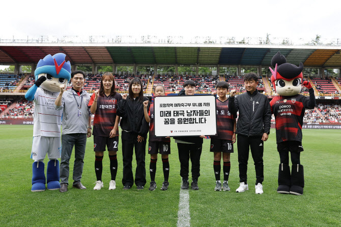 포항은 지난 10일 수원FC와의 하나은행 K리그1 2025 13라운드 안방 경기에 앞서 포항 지역 여자 축구부를 위한 유니폼 전달식을 진행했다.