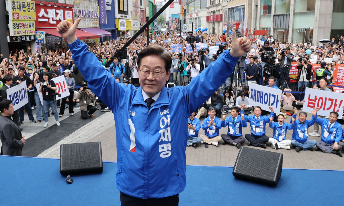 두 손 번쩍 인사 더불어민주당 이재명 대선 후보가 13일 대구 동성로에서 열린 ‘대구 집중유세’에서 양손 엄지를 들어 인사하는 모습. 대구=허정호 선임기자 |