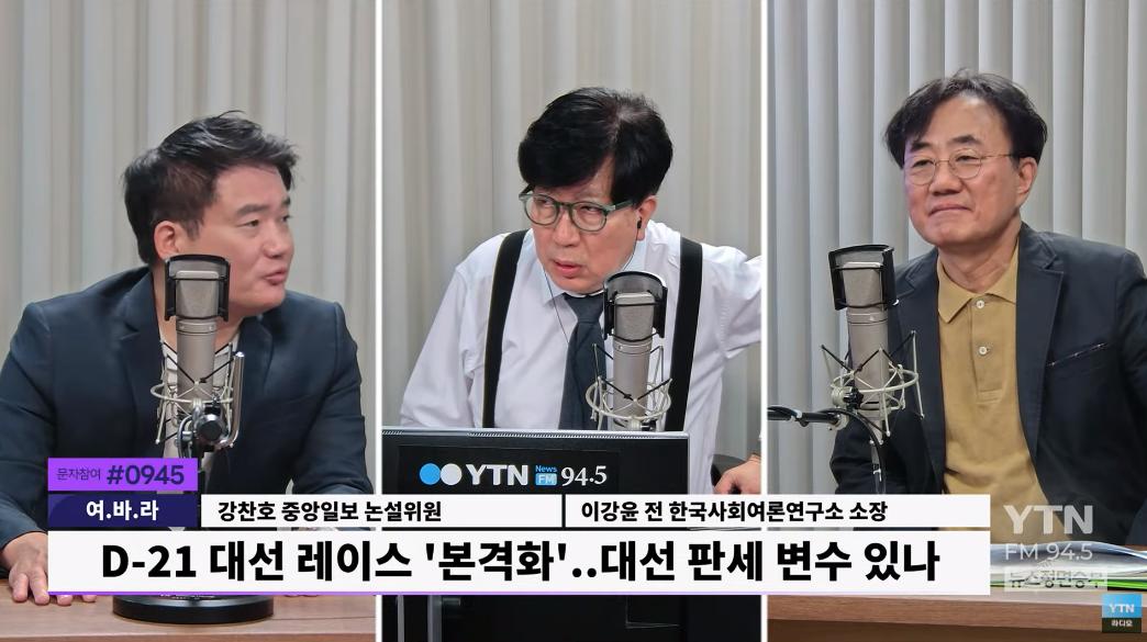 ◆ 신율 : 신율의 뉴스 정면승부 2부 시작하겠습니다. 오늘 2부 제가 오프닝에서도 말씀드린 대로 여론을 바르게 읽는 라디오, 약칭 <여바라>입니다. 오늘 함께해 주실 두 분. 한 분씩 소개해 드리겠습니다. 먼저 중앙일보 강찬호 논설위원이십니다. 안녕하십니까?