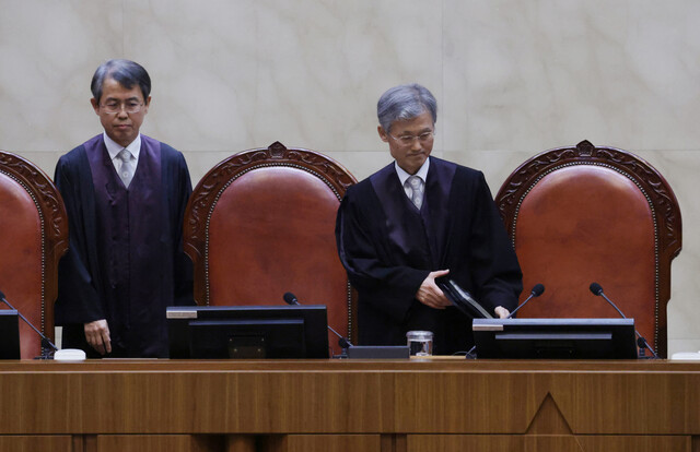 조희대 대법원장(오른쪽)이 지난 1일 오후 이재명 더불어민주당 대통령 후보의 공직선거법 위반 사건 전원합의체 선고를 위해 서울 서초구 대법원 대법정에 입장해 자리로 향하고 있다. 공동취재사진 |