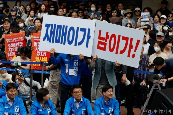 (대구=뉴스1) 안은나 기자 = 이재명 더불어민주당 대통령 후보가 대표적 험지인 대구·경북(TK) 지역 유세에 돌입한 13일 오후 대구 중구 동성로에서 지지를 호소하는 가운데 '재매이(재명이)가 남이가'라고 적힌 피켓을 쓴 지지자가 서 있다. 2025.5.13/뉴스1 Copyright (C) 뉴스1. All rights reserved. 무단 전재 및 재배포, AI학습 이용 금지. /사진=(대구=뉴스1) 안은나 기자 |