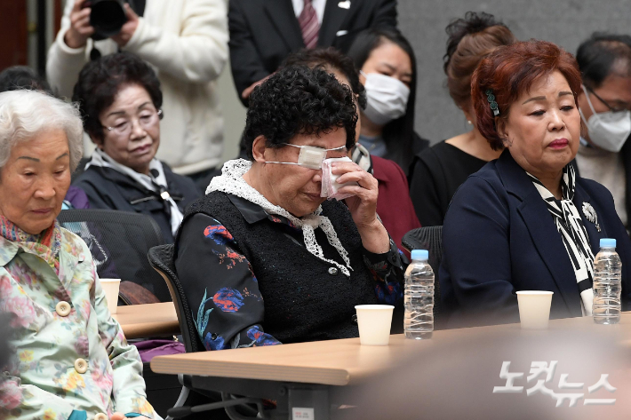2023년 3월 31일 광주 서구 5·18기념문화센터에서 고 전두환씨 손자 전우원씨의 사죄 기자회견에서 5·18유가족이 눈물을 훔치고 있다. 광주=박종민 기자 |