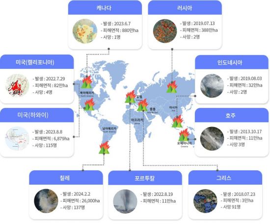 대형 산불은 그간 세계 각지에서 끊이지 않고 발생했다. 2013년 10월 호주에서는 대형 산불로 11만㏊의 산림이 소실되고, 3명이 사망하는 인명 피해를 겪었다. 이후 2018년 7월 그리스에서는 3만㏊의 산림이 소실되고, 91명이 사망했다. 2019년에는 7월 러시아(388만㏊ 소실·2명 사망)·8월 인도네시아(32만㏊·2명 사망), 2022년에는 8월 포르투갈(11만㏊ 소실)·미국 캘리포니아(82만㏊ 소실·4명 사망)에서 각각 대형 산불이 발생해 산림과 인명 피해를 야기했다.