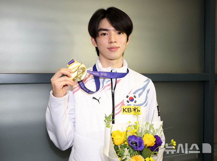 [인천공항=뉴시스] 이영환 기자 = 2025 하얼빈 동계아시안게임 피겨스케이팅 남자 싱글에서 금메달을 획득한 차준환이 14일 오후 인천국제공항 제1여객터미널을 통해 귀국해 포즈를 취하고 있다. 2025.02.14. 20hwan@newsis.com |