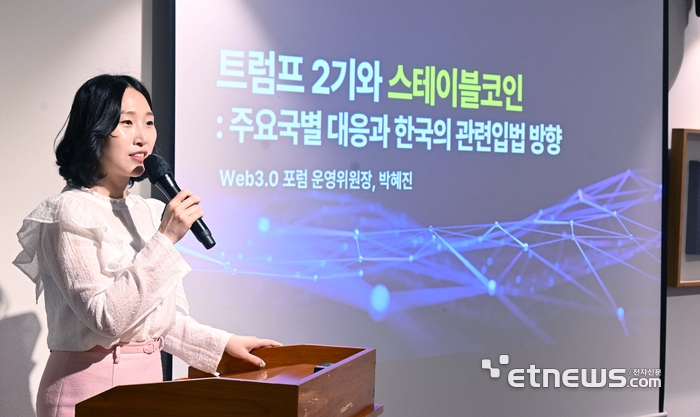 웹3.0 포럼 2025 조찬 라운드 테이블이 14일 서울 중구 달개비에서 열렸다. 박혜진 웹3.0 포럼 운영위원장이 '트럼프 2기와 스테이블코인 : 주요국별 대응과 한국의 관련입법 방향'에 대해 발표하고 있다.