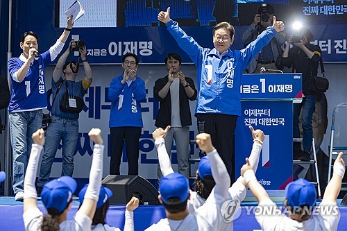 부산 유세에서 엄지 들어 보이는 이재명 후보 |