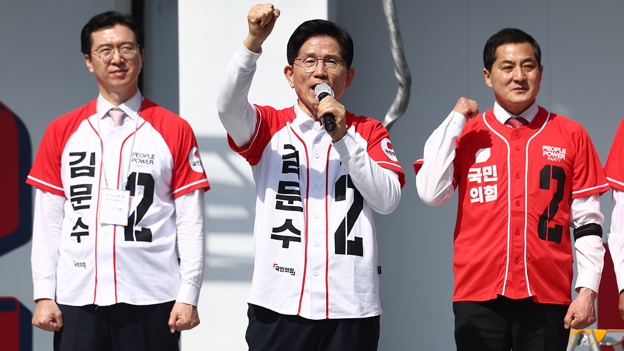 ▲ 국민의힘 김문수 대선 후보가 14일 경남 진주시 진주광미사거리에서 유세를 하고 있다.