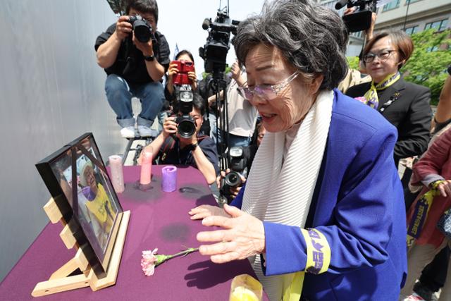 일본군 '위안부' 피해 생존자 이용수(97) 할머니가 14일 서울 종로구 옛 일본대사관 터 앞에서 열린 제1700차 정기 수요시위를 마친 뒤 고(故) 이옥선 할머니 사진 앞에 헌화하고 있다. 심현철 기자 |