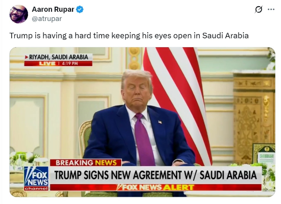 13일(현지 시간) 외신에 따르면 이날 사우디아라비아 수도 리야드 왕궁에서 열린 서명식에 참석한 트럼프 대통령이 의자에 앉아 눈을 감고 조는 듯한 모습이 포착됐다. 이 장면은 폭스뉴스 등 주요 방송을 통해 전 세계에 생중계됐다.